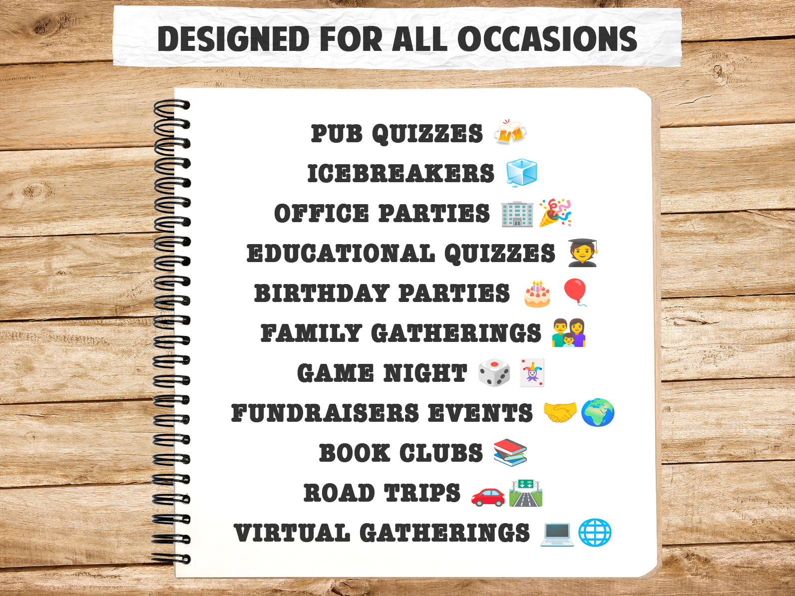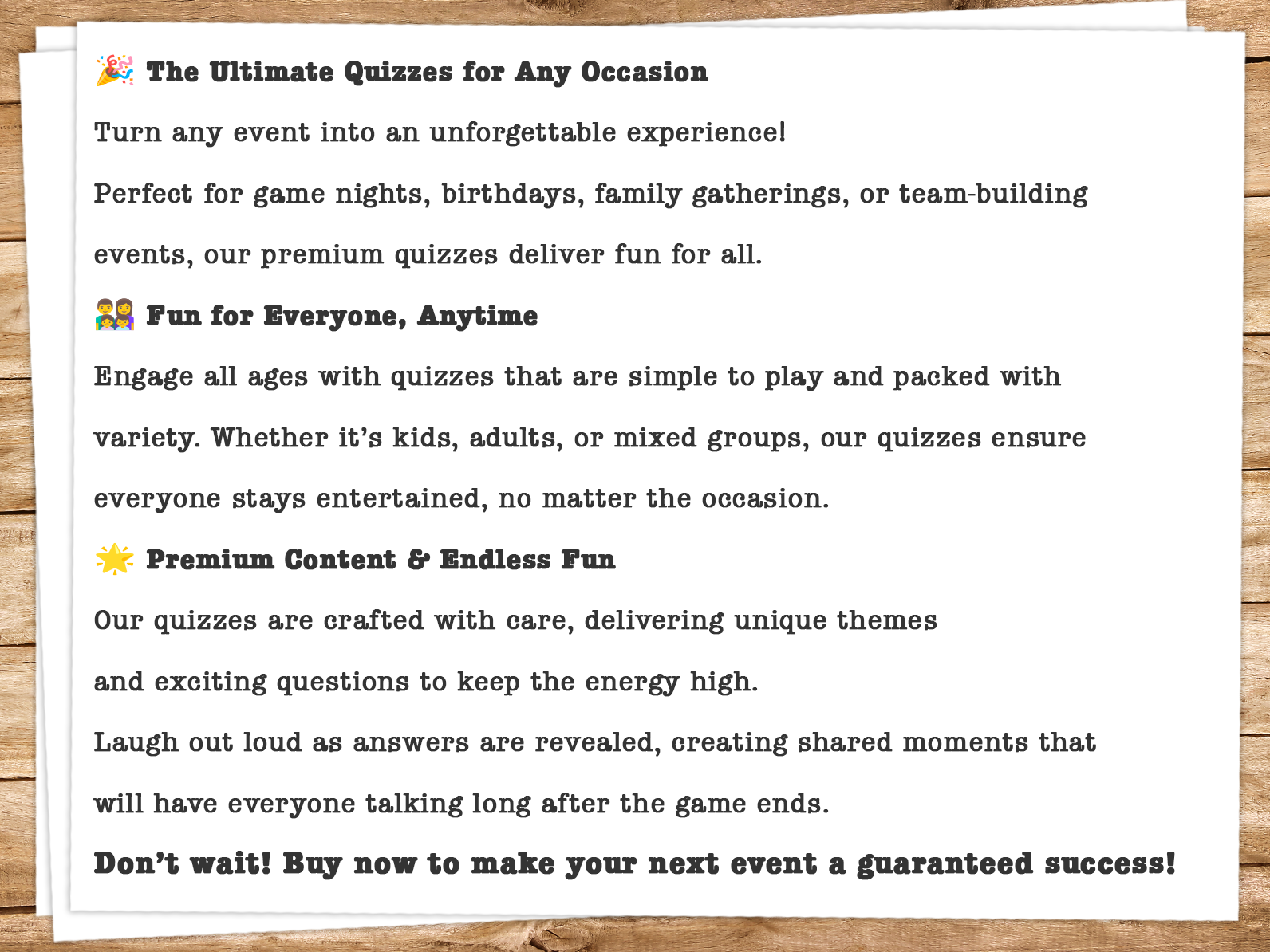 Our quizzes are crafted for easy downloading, printing, and digital display, perfect for family quiz nights, local pub quizzes, or virtual gatherings. Each download includes both full-colour and low-ink options, along with a question sheet, answer sheet, and dedicated spaces for team names and scores. Files are provided in PDF format and are available for download immediately after purchase through our website.