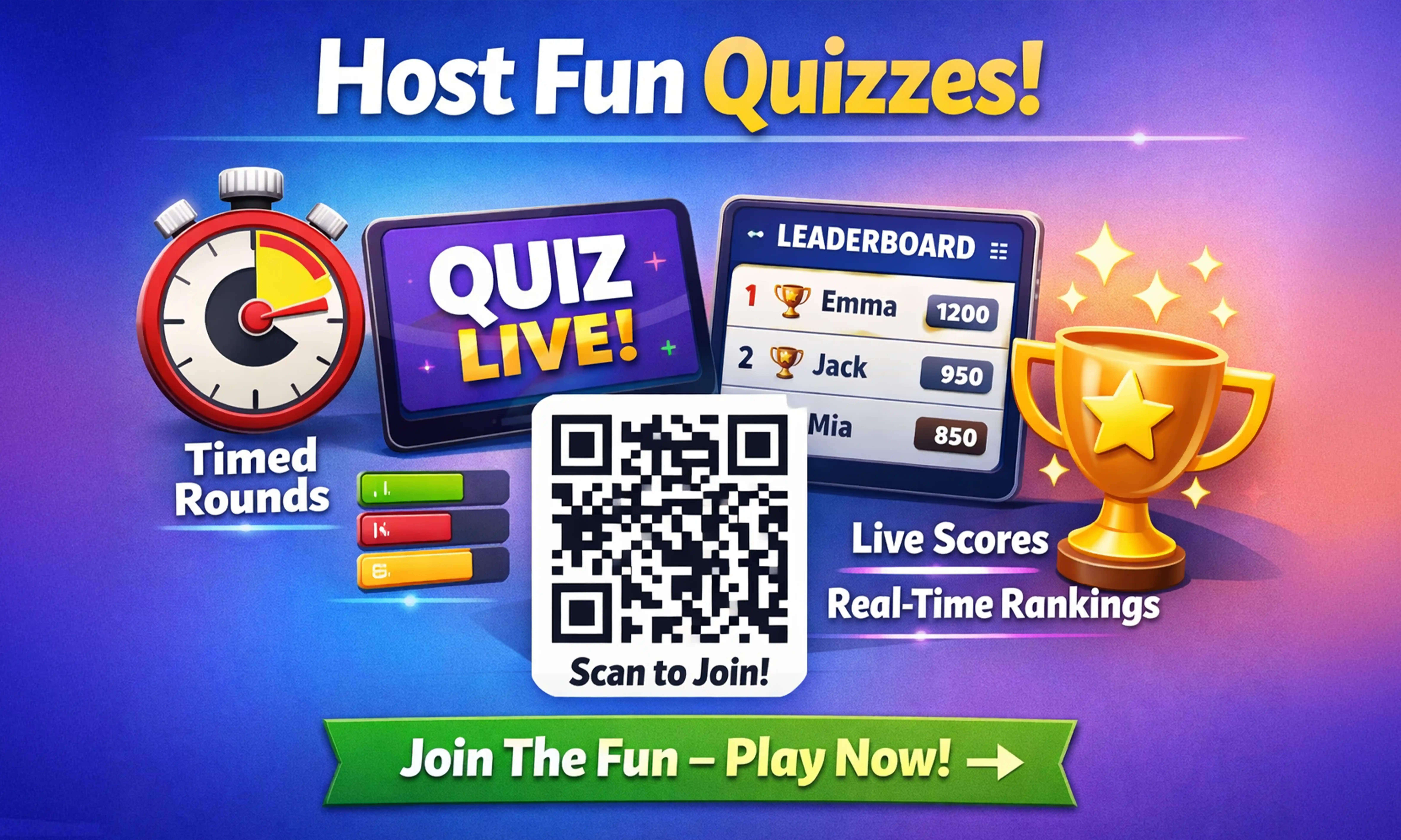 Host quizzes with timed rounds, live scoring, QR code join, and real-time leaderboards. Free to start.